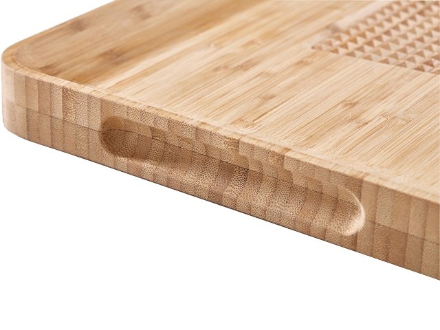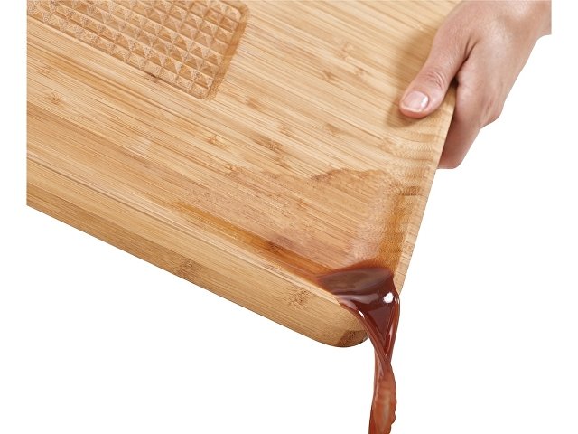 Мультифункциональная разделочная доска. Благодаря небольшому наклону и бортикам по краям, вся лишняя жидкость и кусочки продуктов аккуратно собираются и не пачкают поверхность стола. С обратной стороны доска оснащена нескользящими ножками для фиксации доски на рабочей поверхности.