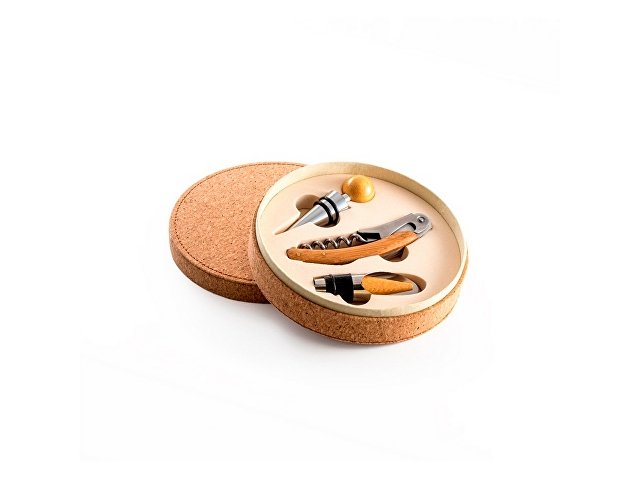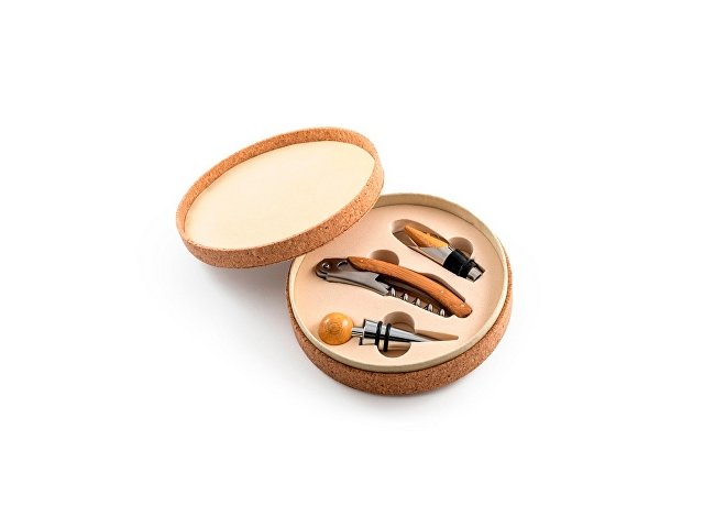 Набор для вина состоящий из 3 приборов из дерева и металла: штопор с ножом сомелье, каплеуловителя и пробки. Поставляется в подарочной коробке из натуральной пробки. ø144 x 42 mm
