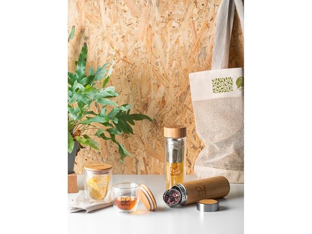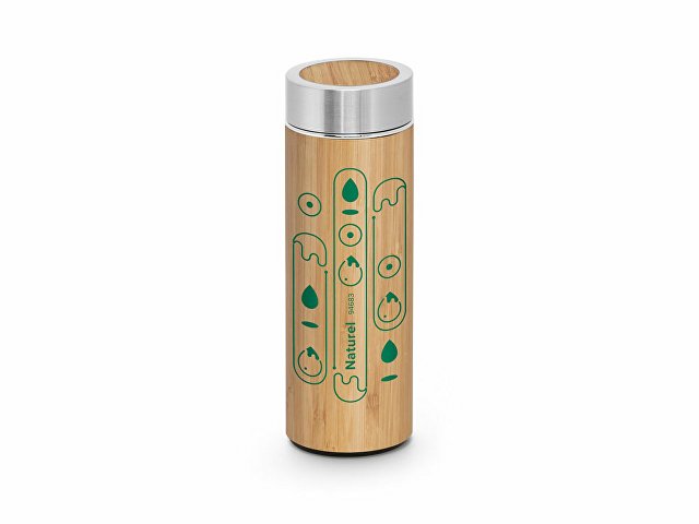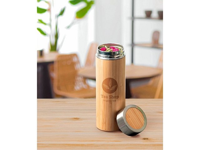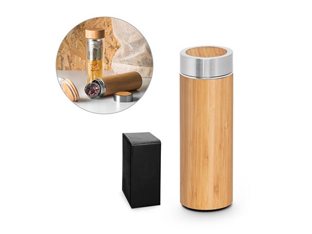 Термос из бамбука и нержавеющей стали с вакуумным двойным корпусом и инфузером для чая. Емкость до 430 мл. Поставляется в подарочной коробке. ø69 x 207 мм